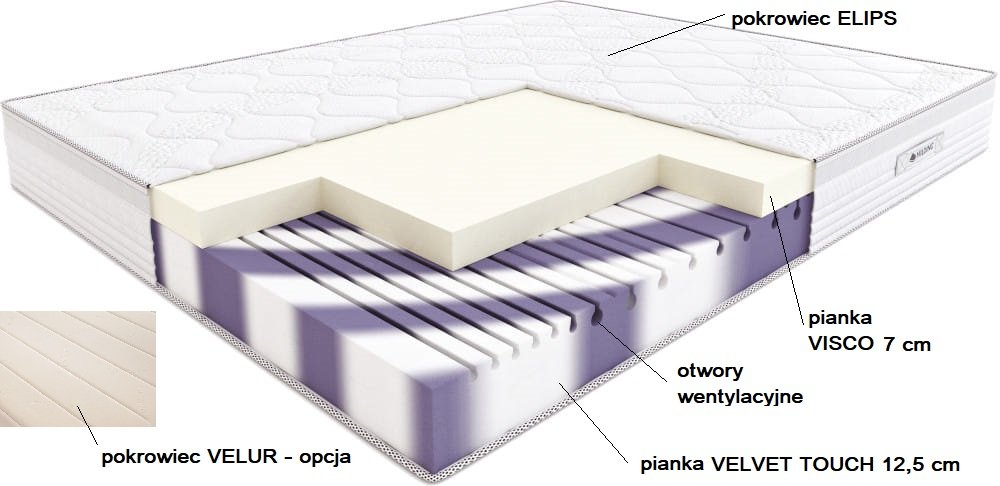 Pokrowiec Velur – pokrowiec z delikatnym welurowym wykończeniem, pikowany jednostronnie pianką Visco z łagodnym aromacie lawendy. Dzięki specjalnej impregnacji hamuje tworzenie i gromadzenie się niebezpiecznych pleśni. Tkanina likwiduje pokarm roztoczy bez użycia substancji chemicznych szkodliwych dla środowiska. Pokrowiec, ze względu na pikowanie jednostronnie pianką Visco o łagodnym aromacie, można prać w temp. do 40oC.