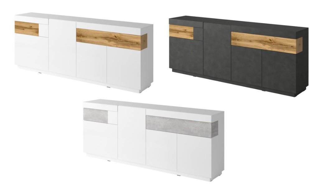 Napisz pierwszą opinię o „SILKE-25 szeroka komoda czterodrzwiowa z szufladami – 220 cm – BIAŁY POŁYSK – DĄB WOTAN – BETON – MATERA”