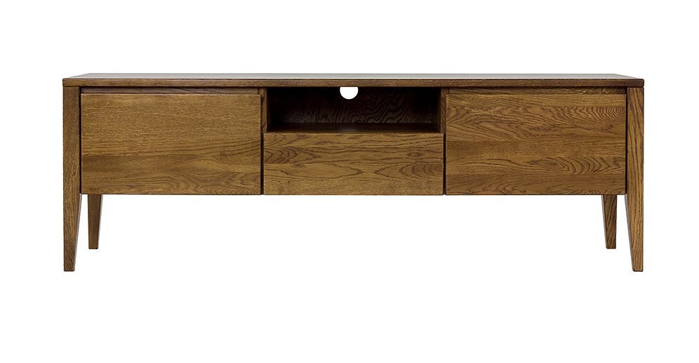 Dębowa szafka RTV to jeden z tych mebli, który przyciąga wzrok już od progu stanowiąc podstawę multimedialnego salonu. Jest połączeniem nowoczesności z nutą stylu vintage. Zaprojektowana tak, by zdobić. Masywna bryła mebla osadzona została na wysokich nóżkach, co dodało lekkości całej konstrukcji. Jej atutem jest funkcjonalność. Pojemne, bezuchwytowe szafki i szuflada pomieszczą domowe bibeloty. Wyposażona w otwartą półkę na sprzęt rtv, który posiada specjalne otwory na kable oraz zapewnia cyrkulację powietrza.