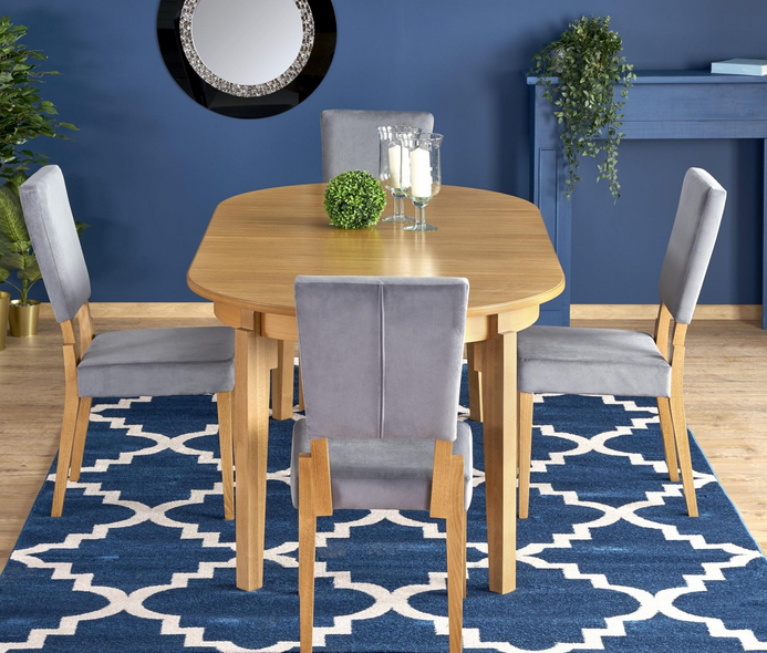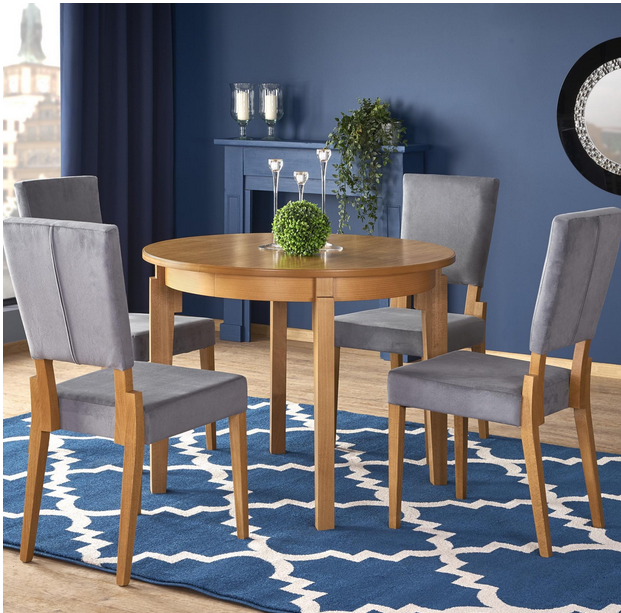 Okrągły stół BORYS dąb miodowy przypadnie do gustu osobom, które cenią sobie praktyczne rozwiązania. Mebel powstał w Polsce, a do jego produkcji użyto takich komponentów jak płyta MDF i okleina naturalna dębowa. Nogi stołu powstały natomiast z litego drewna bukowego. Mebel wyróżnia się modną kolorystyką, ponieważ blat wykończony został w kolorze dąb miodowy, natomiast nogi mają odcień grafitowy. Model ten będzie więc doskonałym wyborem do wielu wnętrz, zwłaszcza tych o charakterze loftowym. Dużą zaletą stołu jest możliwość jego rozkładania, dzięki czemu można zwiększyć jego powierzchnię. Po rozłożeniu przy stole można swobodnie posadzić nawet 8 osób.