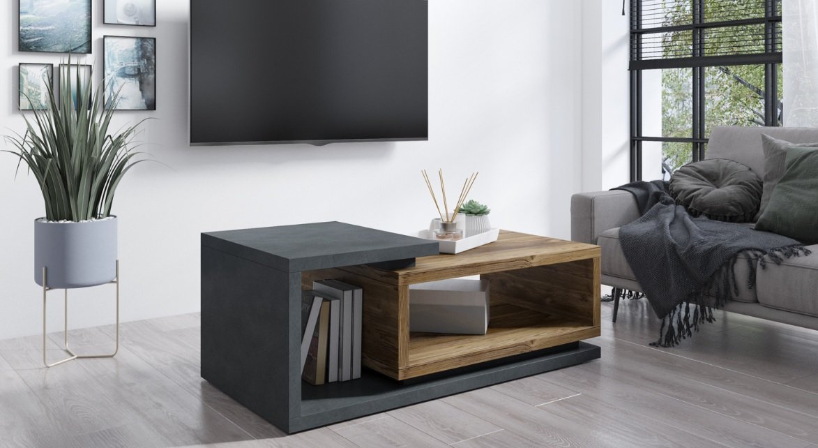 Asymetryczne bryły systemu , tworzą unikalną meblościankę livingową, stanowiącą połączenie funkcjonalności ze sztuką nowoczesną, pełniącą ważną rolę w nowoczesnych i minimalistycznych wnętrzach.