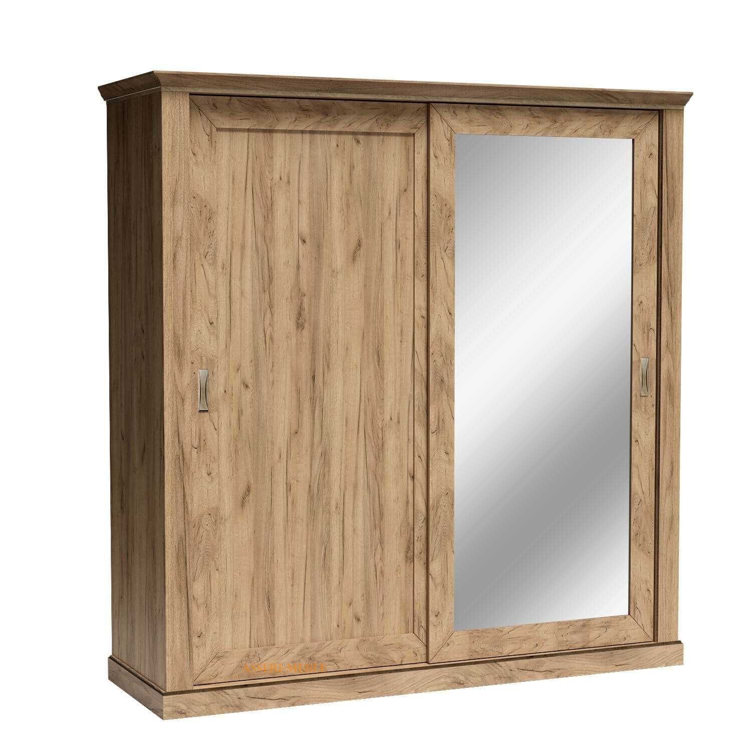 Szafa ANTICA-211  mająca dwoje przesuwnych drzwi, w tym jedne z lustrem. Duża i bardzo pojemna, posiada cztery szuflady oraz osiem półek. Swoją sekcję otrzymał również drążek, który pozwala na zawieszenie ubrań, jak i na zagospodarowanie pozostałej przestrzeni szafy. Mebel pasuje do sypialni, przedpokoju czy salonu. Można tworzyć z nim wiele aranżacji. Szafa ta przypadnie do gustu zwolennikom klasycznego wyglądu  oraz nienachalnej elegancji. Dostępna w wybarwieniu Kraft Złoty.