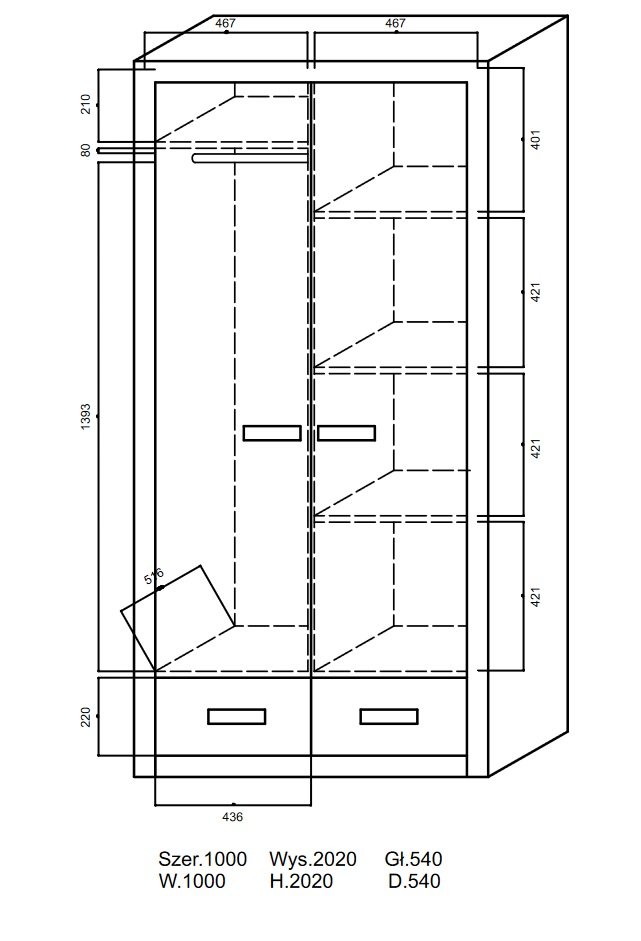Szafa składa się z części dwudrzwiowej oraz dwóch szuflad. Podział wewnętrzny szafy na zdjęciach podglądowych. Szafa pasuje do takich pomieszczeń jak sypialnia czy też garderoba. Bogata paleta kolorów sprawia że szafa dopasuje się idealnie do każdej kolorystyki wnętrza.