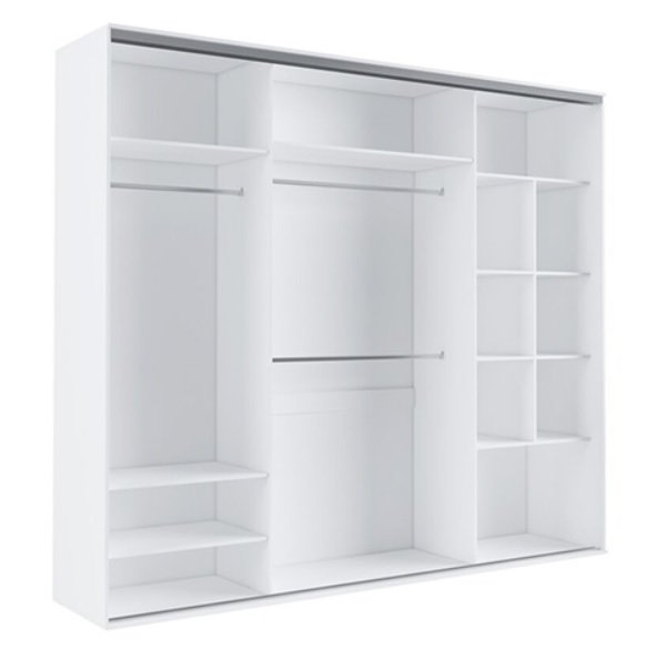 Pojemne wnętrze z przemyślanym układem półek różnej wielkości oraz trzema drążkami pomieści sporą ilość ubrań.