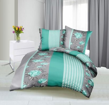 Wzór w turkusowe róże na szarym tle jest głównym elementem tej pościeli, zapewniając romantyczny i kwiatowy akcent, który nadaje wnętrzu przytulnego i ciepłego klimatu. Kwiaty układają się w harmonijną kompozycję, zachwycając swoim delikatnym wyglądem i emanując subtelnością.