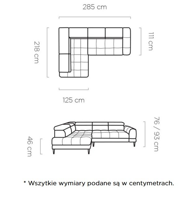 VOSS L narożnik z funkcją spania, pojemnikiem oraz regulowanymi zagłówkami 285 x 218 cm