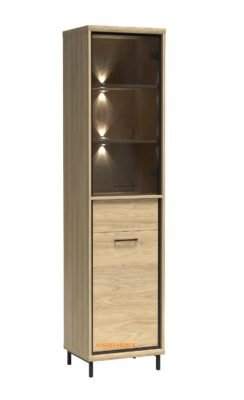Witryna w kolorze HIKORA NATURALNA z czarnymi dodatkami w postaci dekoracyjnej listwy i czarnych, metalowych uchwytów. Górna część to szklana witryna z dwoma półkami z płyty laminowanej i przydymionym, szklanym, hartowanym frontem. Dolna część to otwierana szafa z jedną półką z płyty laminowanej. Nad szafą znajduje się szuflada wysuwana na prowadnicach, która otwiera się w bardzo wygodny sposób – na dotyk.