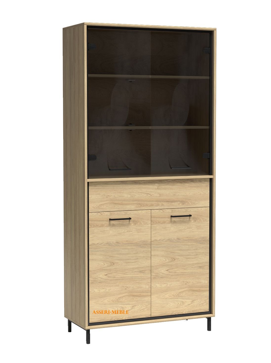 Górna część witryny składa się z podwójnych frontów z przydymionego, hartowanego szkła i dwóch półek z płyty laminowanej. Dół witryny to jasne fronty z czarnymi, metalowymi uchwytami za którymi mamy do dyspozycji półkę. Nad dolną częścią znajduje się wysuwana szuflada, która otwiera się na dotyk. Wykorzystany nowoczesny system otwierania push to open. Można wykorzystać do niej dodatki takie jak czarne nogi, które będą pasować do czarnych listew i stworzą idealne zestawienie. Dla lepszego efektu możemy wykorzystać oświetlenie LED półek szklanych i dekoracyjnej deski.