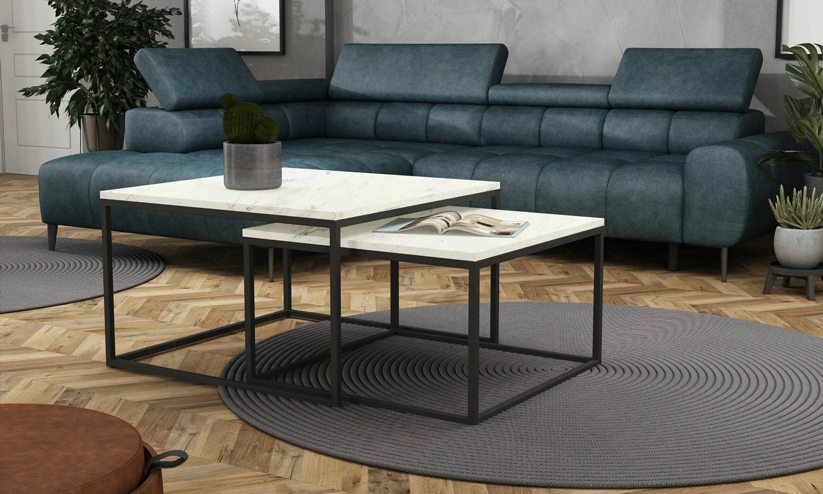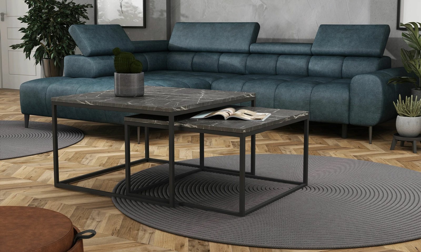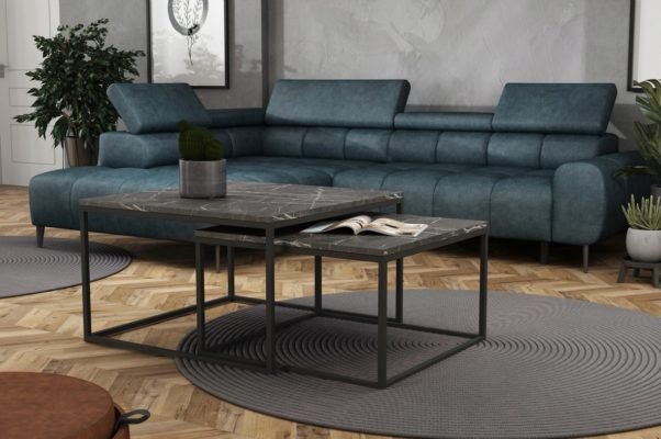 Rewelacyjny zestaw stolików z blatem z w kolorze marmur ciemny to propozycja dla wnętrz w stylu loftowym, ale również dla pomieszczeń tradycyjnych.
