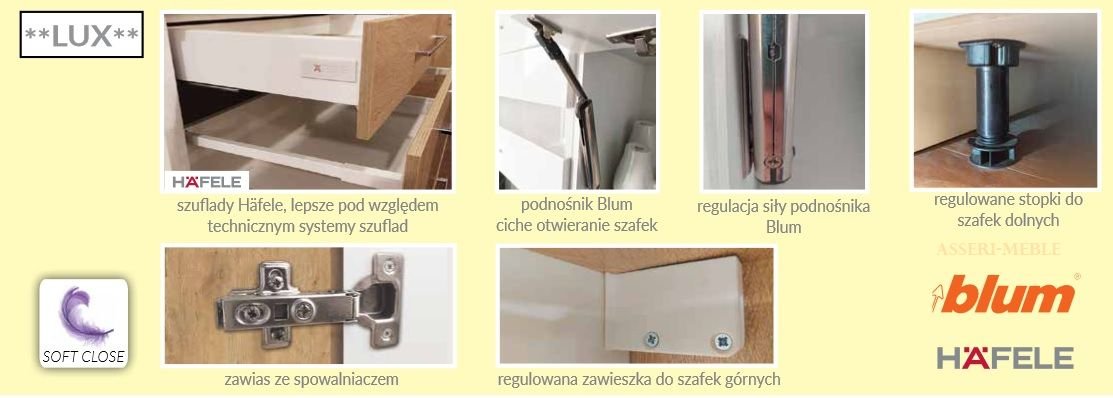 • Szafki klapowe posiadają podnośniki BLUM umożliwiające ciche zamykanie i regulację siły zamykania szafek