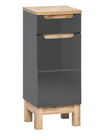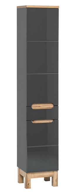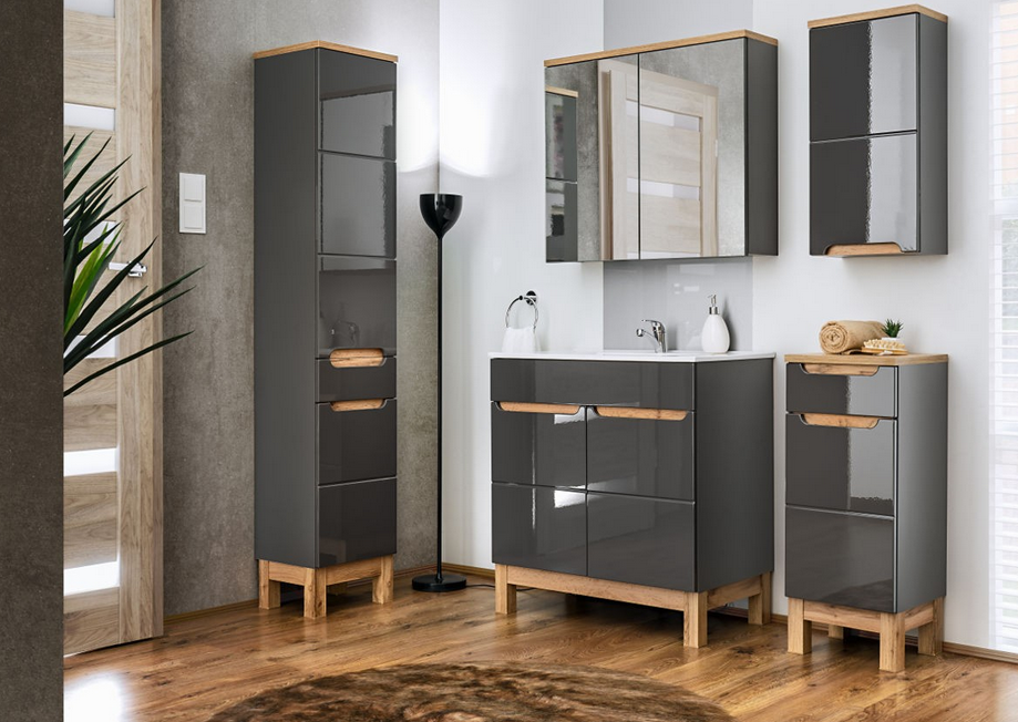 Bali to kolekcja, która imponuje wzornictwem – połączenie solidnych korpusów z frontami w szarym połysku oraz drewnianymi detalami sprawia, że meble stają się centralnym elementem wystroju łazienki.