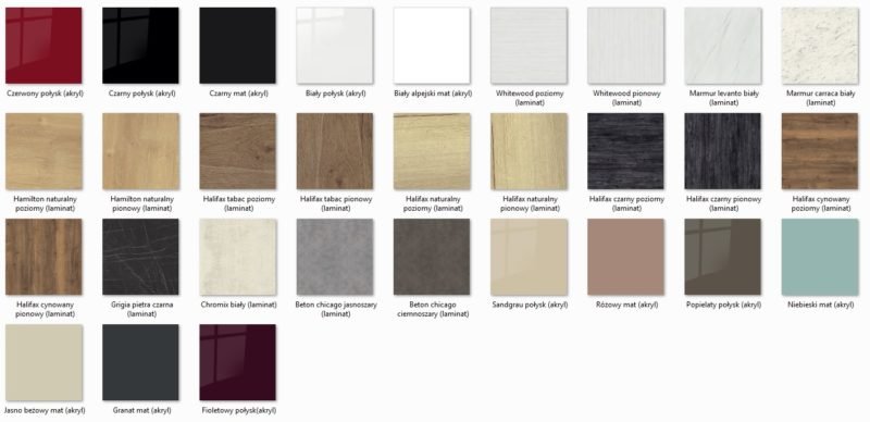 • Wszystkie szafki z kolekcji wyposażono w korpus dostępny w 4 kolorach płyty – do wyboru