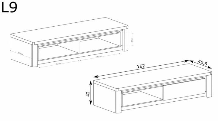 Duża, nowoczesna szafka pod telewizor. Szafka posiada z prawej strony zamykaną szafkę z frontem w formie klapy, otwieraną do dołu. Lewa strona to otwarta półka na której można postawić dekoder czy sprzęt muzyczny. Strefa telewizyjna w salonie jest miejsce gdzie spędzamy bardzo dużo czasu. Umili nam czas oświetlenie zastosowane w meblu, możemy z niego skorzystać o zmroku.